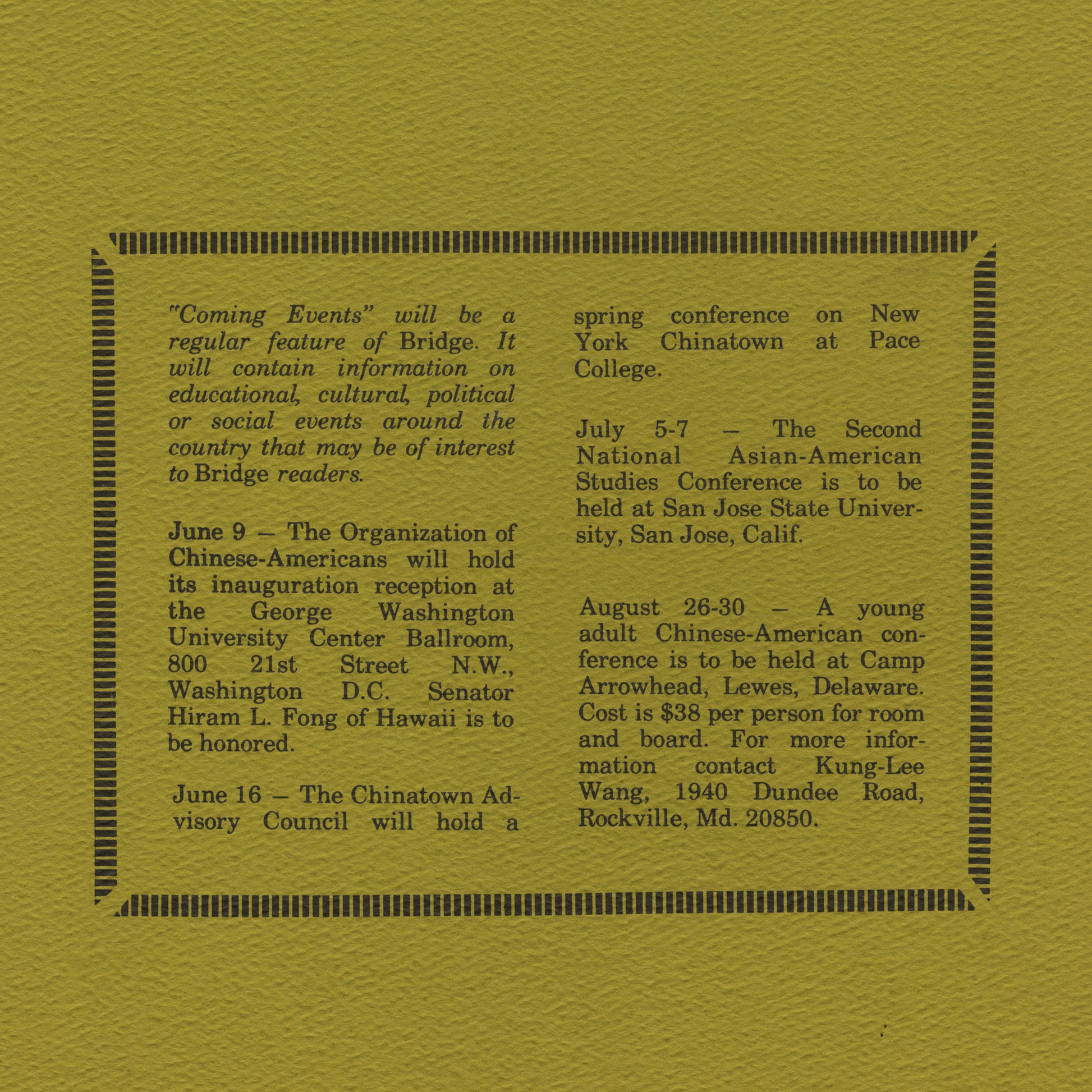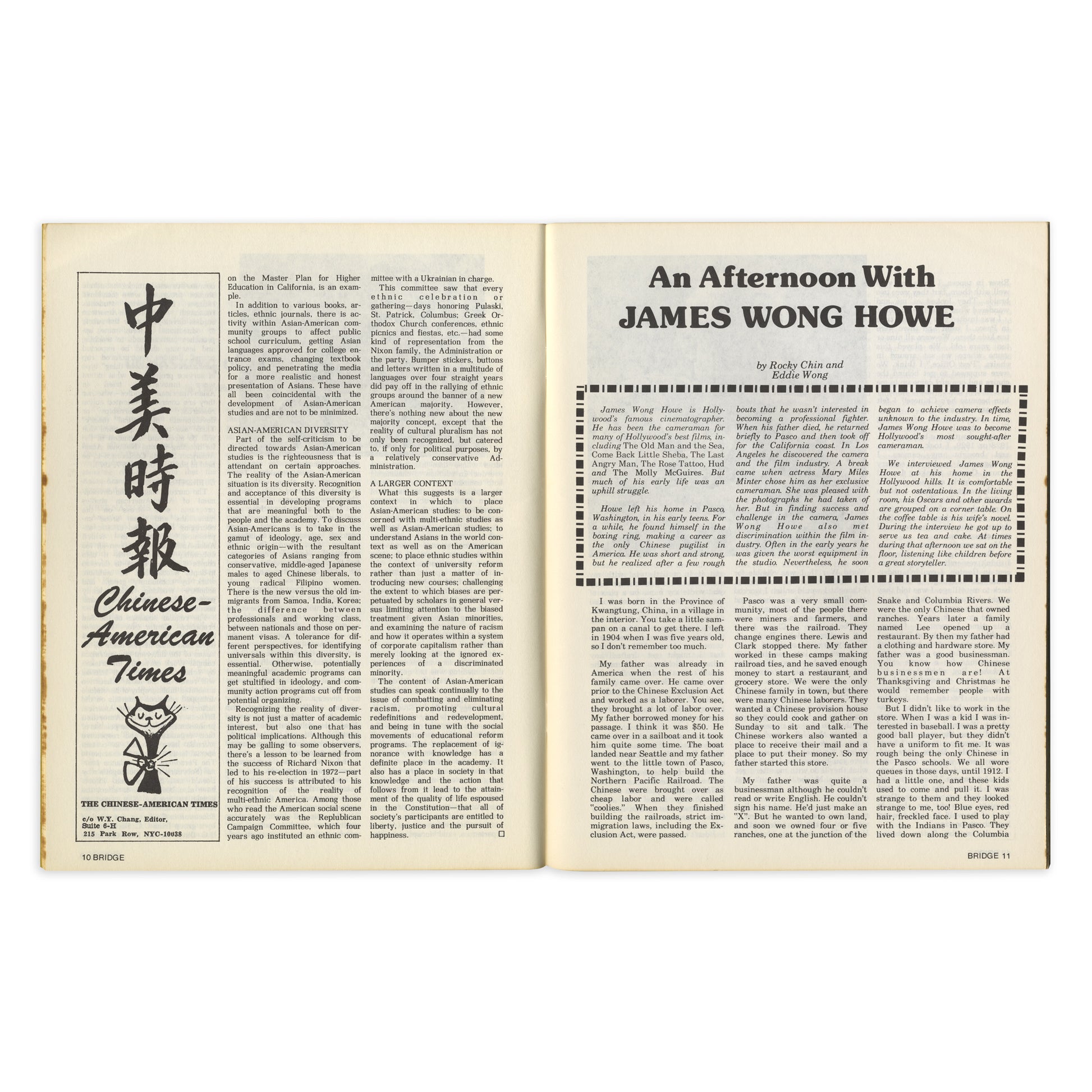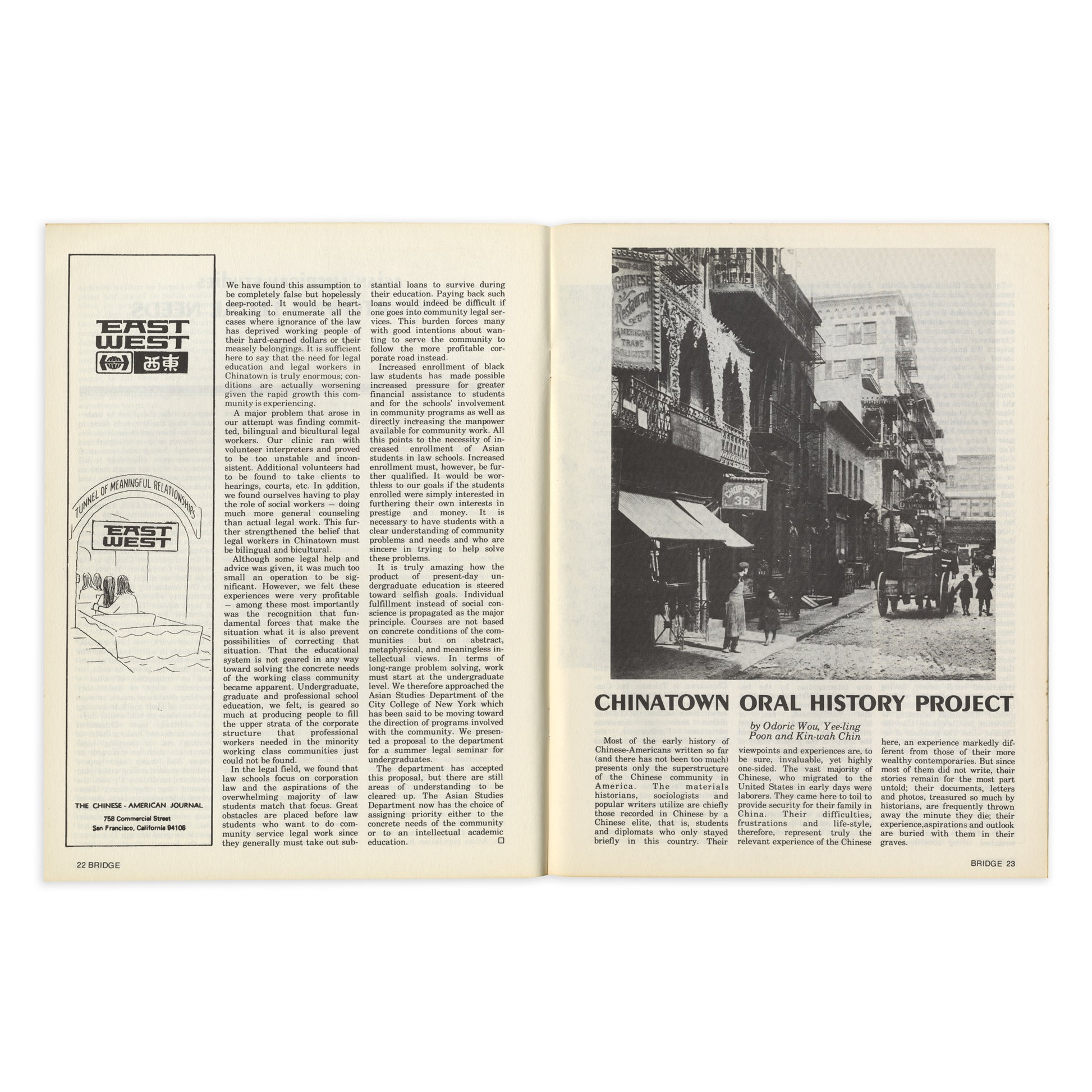 “Asian American Studies” by Bridge (June 1973 issue). Bridge was an Asian American bi-monthly magazine published by the Basement Workshop – “an independent, non-profit, cultural organisation of Chinese professionals and students on the East Coast”. Historically, the mainstream American press had spoken for the white majority, either ignoring the experiences of Asian Americans and other people of color or covering their neighborhoods and members disparagingly. Bridge was born from the need to an alternative Asian American press that could speak to a diverse array of perspectives and social issues.