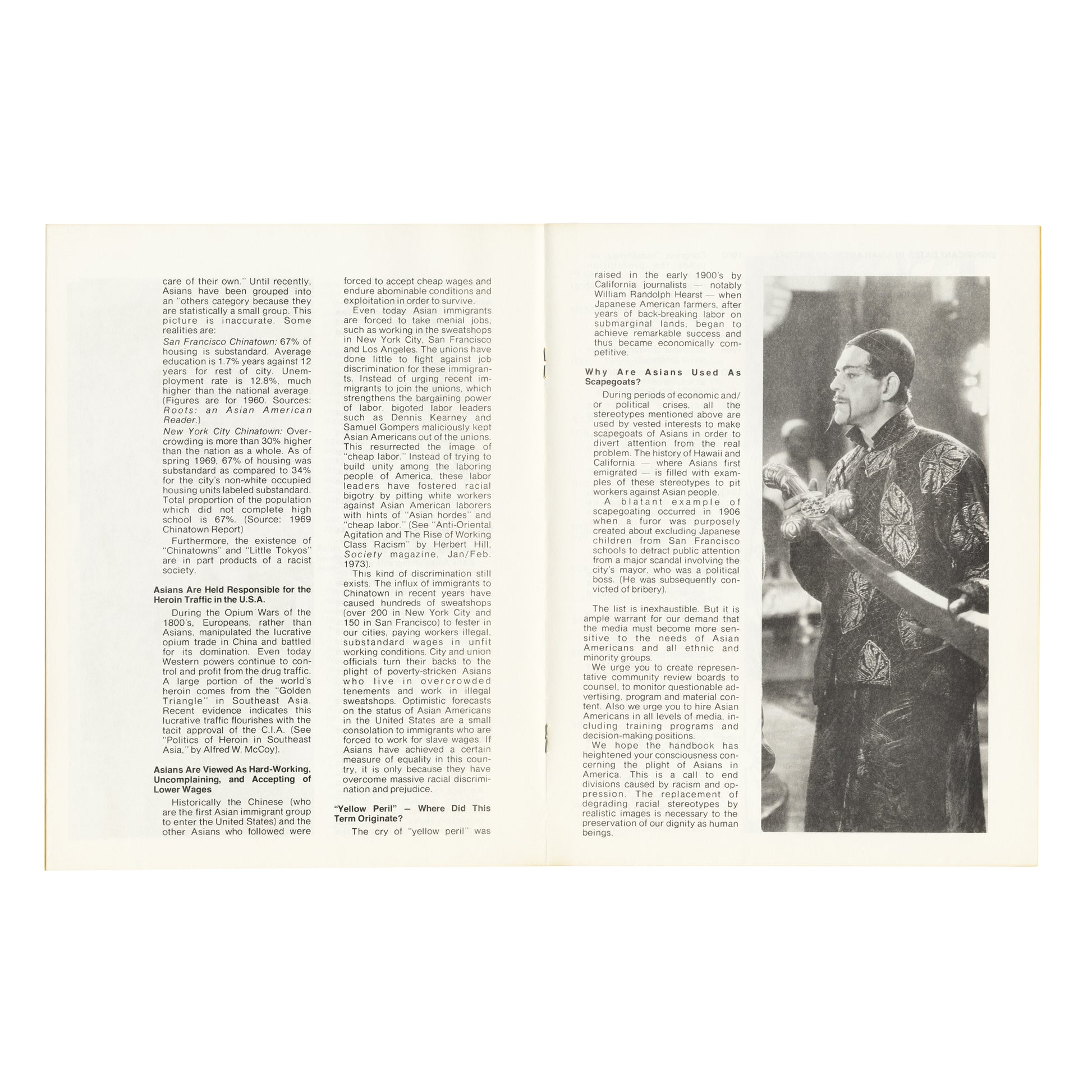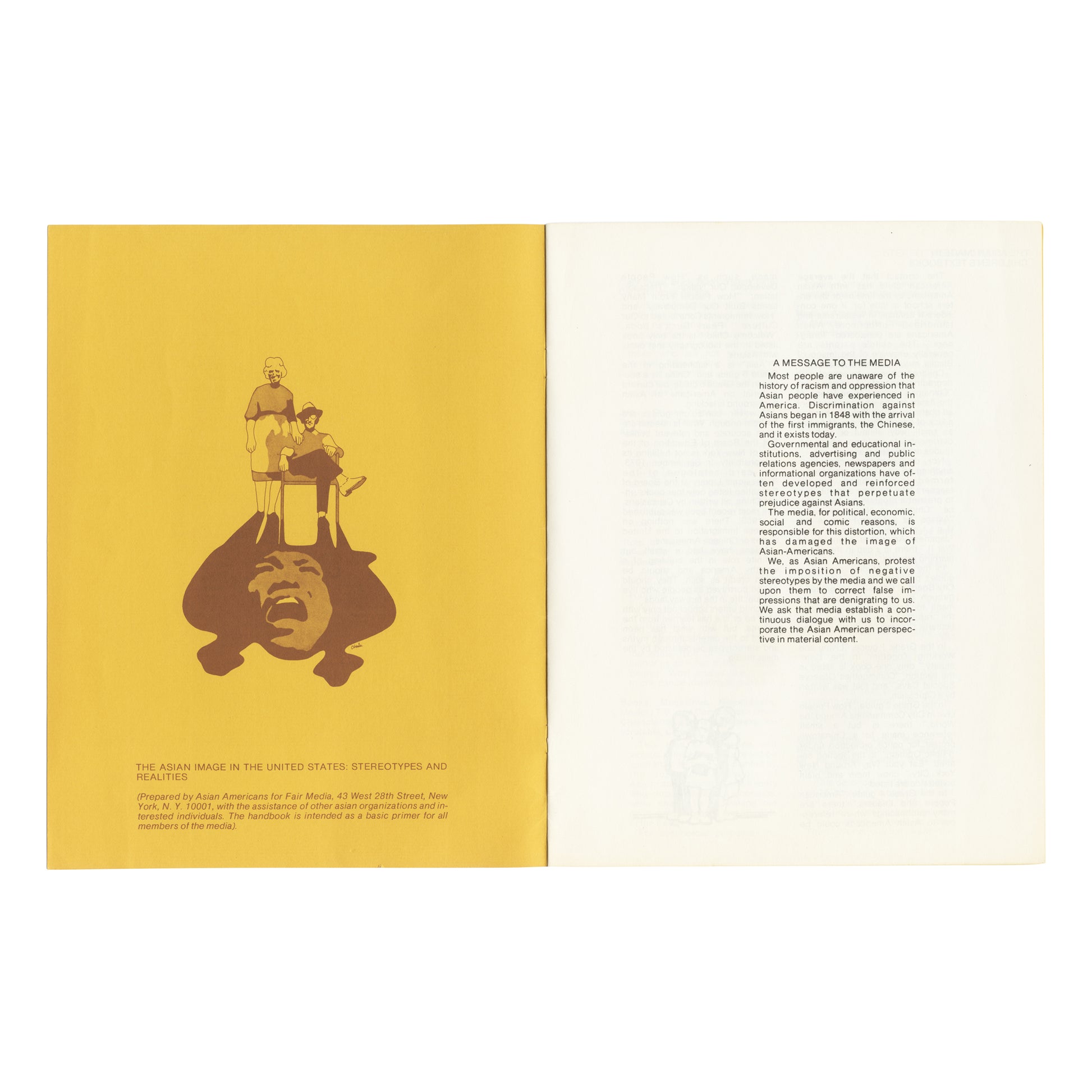 The Asian Image in the United States: Stereotypes and Realities is a handbook -“a basic primer”- published by Asian Americans for Fair Media, a New York-based organisation from the 70s. The publication studies the demeaning representation and stereotypes of Asian Americans in the media, as well as offering explanations of their harm. It includes brief timelines of Asian ethnic groups’ histories in the U.S. and a solid bibliography in books, periodicals, magazines, booklets and films.
